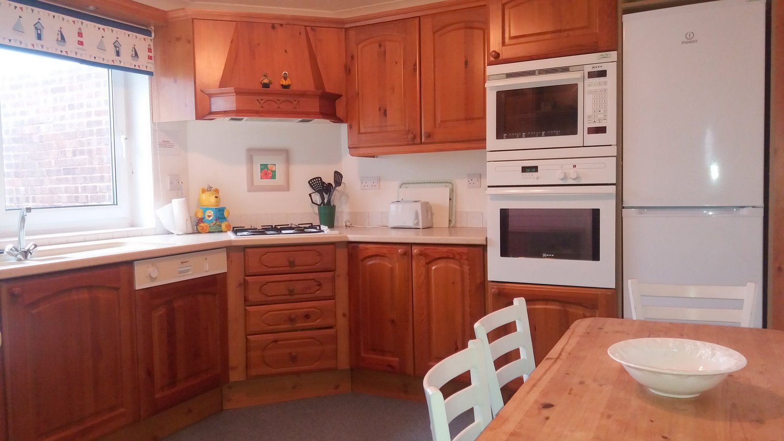 Kitchen Large kitchen with table and chairs, gas hob, electric double oven, microwave, large fridge / freezer, dishwasher, washing machine. Tumble dryer in hallway cupboard.