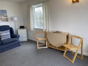 Lounge, Three seater and 2 armchairs, small dining table and 4 chairs. TV/DVD , Excellent views across greensward to sea, and views towards Walton on Naze from the lounge and main bedrooms. Door to enclosed balcony with table and chairs.
